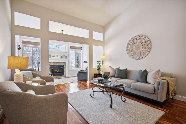 Fabulous and fresh townhome in Sandpiper Ponds Community. Floorplan lives like a one level with only a few steps up and down from spacious foyer. Open floor plan with sunroom and natural gas fireplace. Beautiful wood floors throughout main level, vaulted ceilings. Spectacular nature views from deck. Custom cabinets and lovely granite counter tops in remodeled kitchen. Newer lighting. Fresh decor. Main level primary suite with private ensuite bath and walk-in closet. Spacious family room with recessed lighting and newer carpet walks out to patio with view of nature and wetlands.